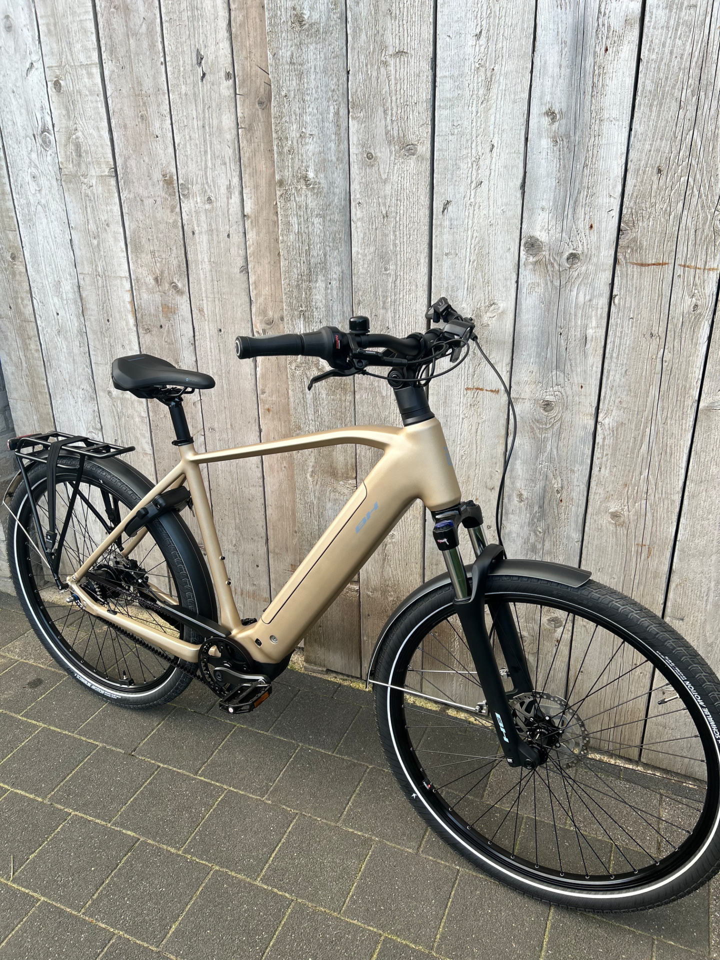 Elektrische stadsfiets van BH met de middenmotor van Bosch. Riemaandrijving en Shimano Nexus versnellingen.